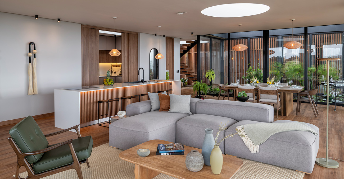 Materiales como el fique, el algodón o el cobre transforman la forma en que la luz se comporta dentro del hogar. Las fibras naturales suavizan la iluminación y permiten que la luz cálida atraviese el tejido, creando una atmósfera envolvente. Por eso, cada vez más proyectos incorporan lámparas tejidas a mano como elementos centrales en salas, comedores y dormitorios. Una lámpara artesanal no es solo una fuente de luz. También introduce textura, escala y presencia en el espacio. En una sala, piezas como Nasaya o Veracruz pueden transformar el ambiente cuando cae la tarde, filtrando la luz a través del tejido y creando una atmósfera tranquila. En comedores, luminarias como Tatacoa o Nuquí ayudan a definir el lugar del encuentro, concentrando la luz sobre la mesa y generando un ambiente cálido y acogedor. Las casas analógicas buscan precisamente eso: espacios que inviten a quedarse, a conversar y a desacelerar. La iluminación cálida, los materiales naturales y los objetos artesanales ayudan a construir interiores que se sienten más humanos y más habitables.